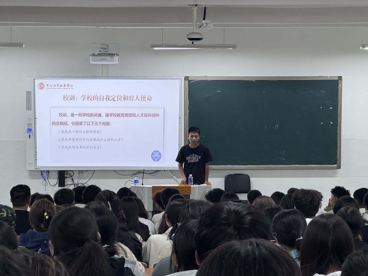 活动中,辅导员首先对“一训三风”进行解读。校训作为学校的精神旗帜,凝练学校的办学理念与价值追求,是全体师生共同遵循的行为准则;校风体现了学校的整体风貌,是师生在长期教育教学实践中形成的风气总和;教风聚焦教师队伍建设,强调为人师表、严谨治学的职业素养;学风则针对学生群体,倡导勤学善思、求真务实的学习态度。