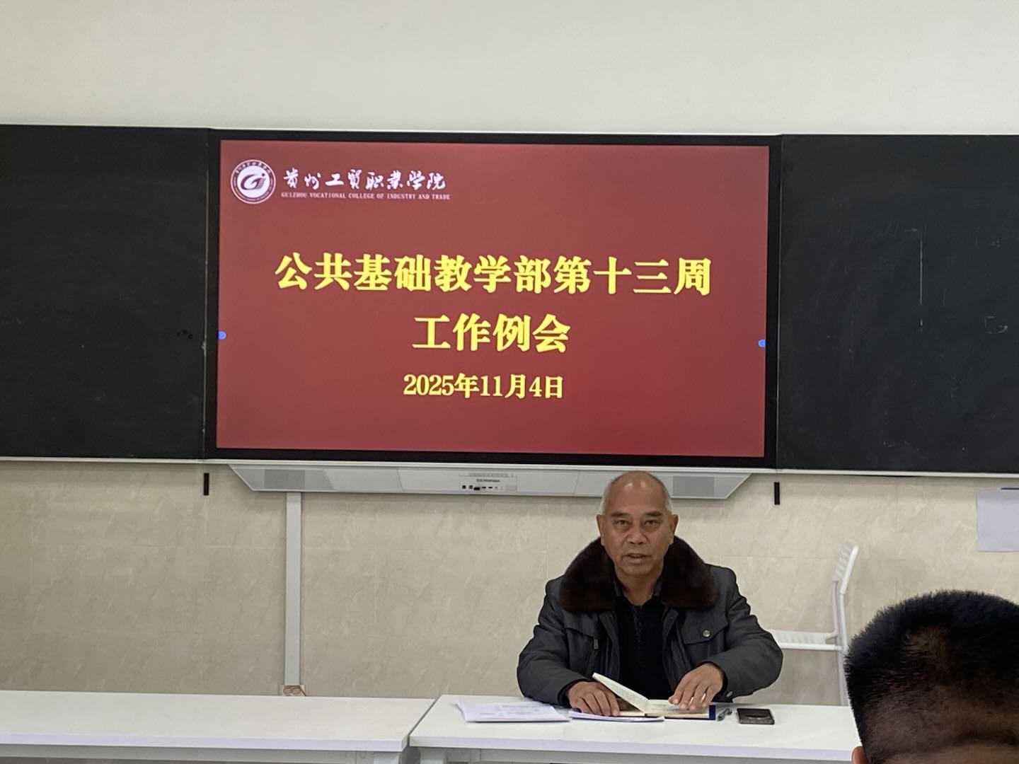 11月4日, 公共基础教学部召开第十三周部门工作例会,全体教职工参会。会议由公共基础教学部主任李加茂主持。办公室主任秦绍学就党员活动室建设进展情况进行详细说明。目前,活动室核心建设内容已基本完成,墙面宣传板布置全面落地,按照标准安装了包含党旗、入党誓词、党员权利义务等主题的宣传板,同步搭建党务公开栏框架,后续将定期更新支部工作计划、党费收缴、发展党员等内容,确保党建信息公开透明。会议桌椅已全部配备到位,桌椅摆放合理,可满足党员集中学习、小型会议等基础活动需求。尚未完成的收尾工作主要为宣传板细节优化及多媒体一体机的安装和调整,相关工作正加紧推进。预计下周完成全部收尾工作并正式投入使用,确保活动室成为党员教育的主阵地、组织生活的规范场所。
