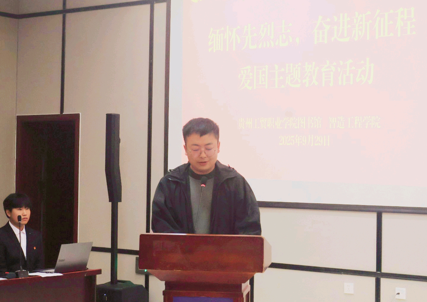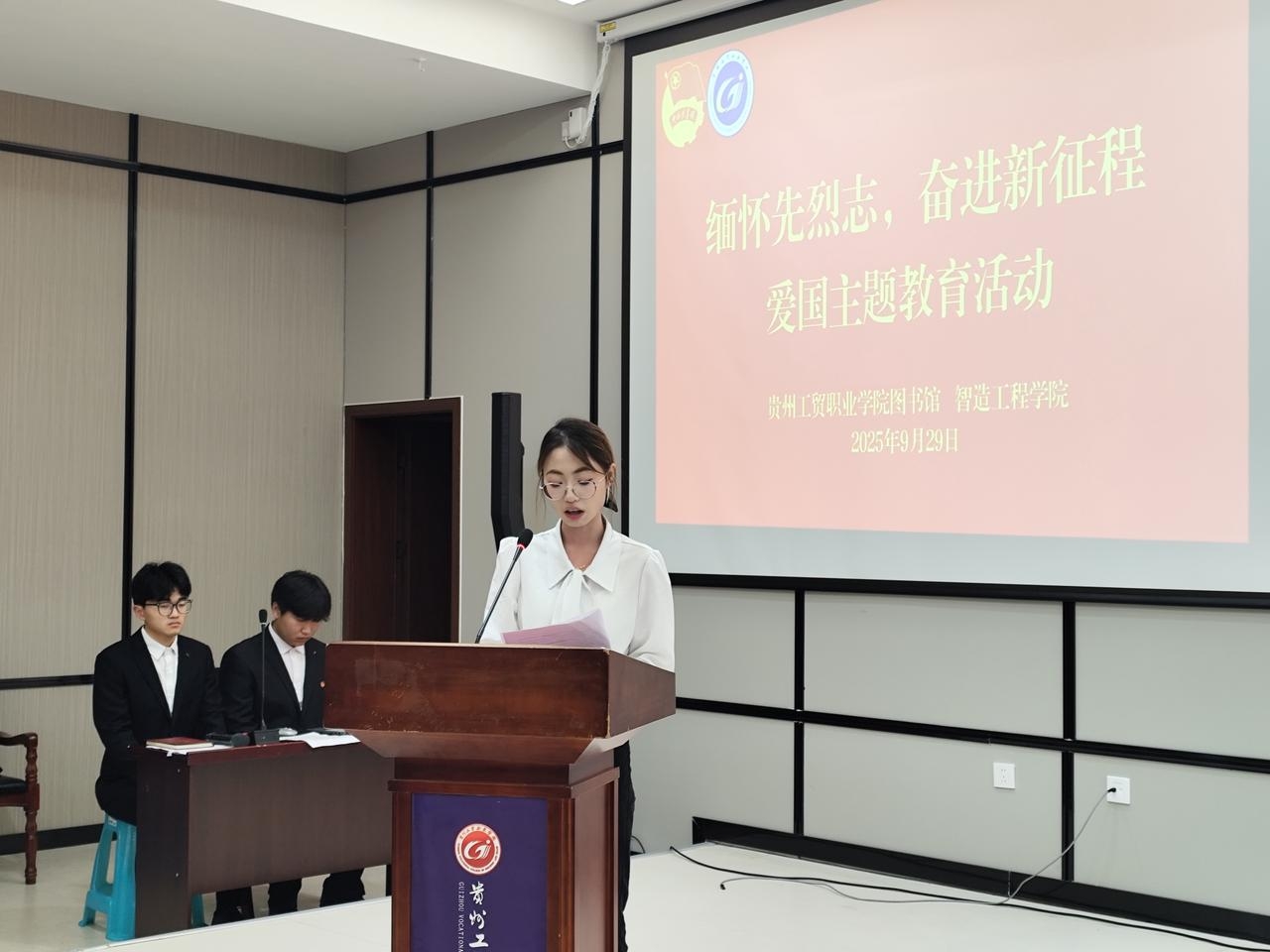 在第12个中国烈士纪念日(9月30日)来临之际,图书馆与智造工程学院联合举办“缅怀先烈志,奋进新时代”爱国主题教育活动。智造工程学院团委书记朱静静,图书馆教师马翔,学院学生会干部及2025级学生代表参与活动。活动在庄严的《中华人民共和国国歌》声中拉开帷幕。全体师生肃立齐唱,歌声嘹亮,展现了师生昂扬的精神风貌,激发了大家的爱国情怀与时代责任感。