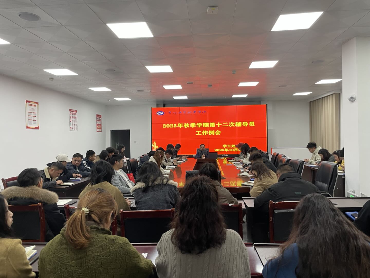 10 月 27 日,学工处组织开展第十二次辅导员工作例会。党委副书记、纪委书记聂立新,学工处处长庹志兴,校团委书记江燕虎及全体团学工作人员、各二级学院团支部书记、学工科长、全体辅导员共同参会。此次会议以辅导员队伍建设、学生管理、外出学习、校园文化建设为核心议题,系统部署相关工作,明确各项任务的具体要求与推进节点,为后续学校学生工作的有序开展提供了清晰指引。