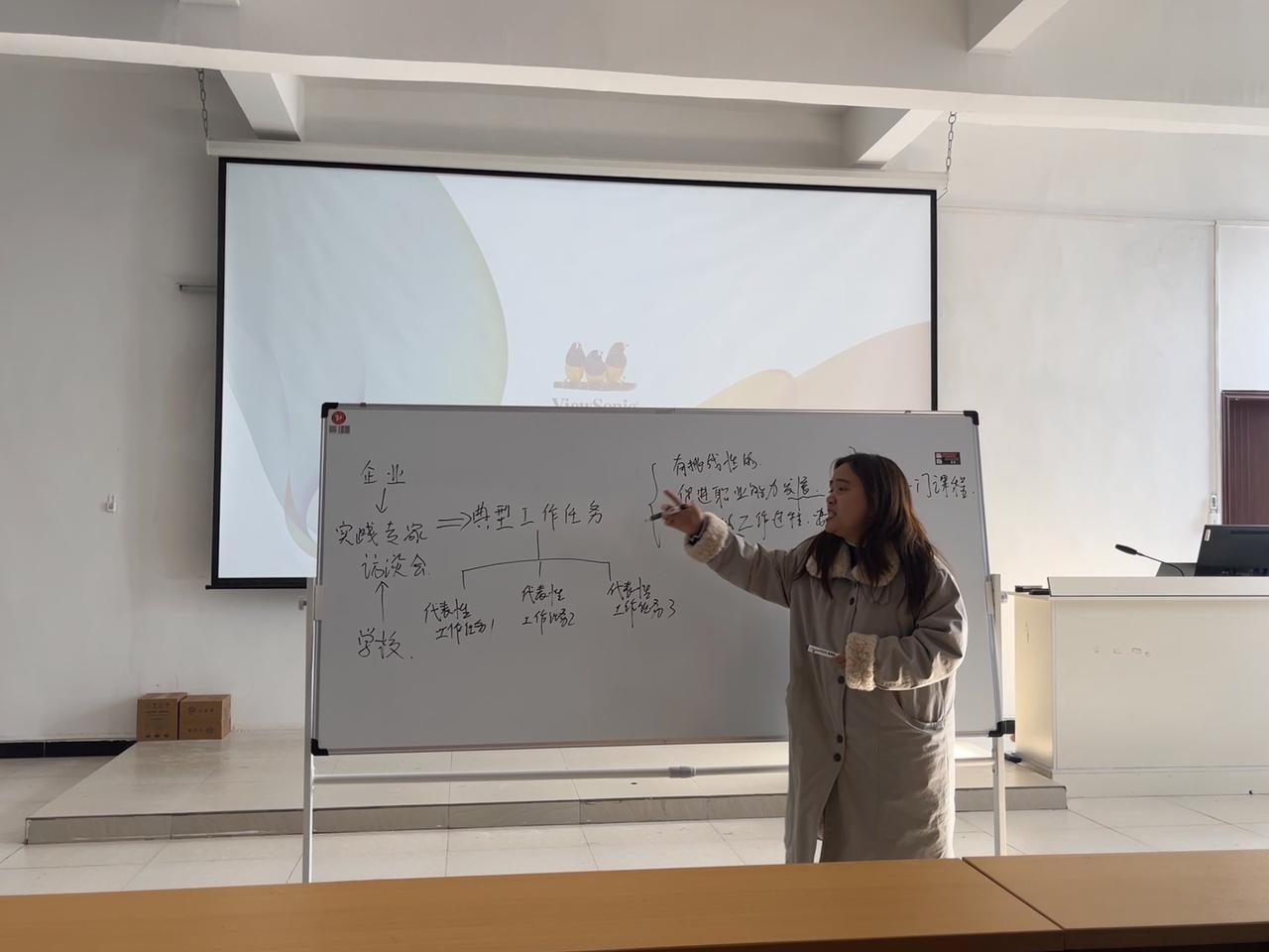 培训中,教职工们积极思考、踊跃发言,共同探讨如何将先进的工学一体化理念有效融入实际教学与管理工作中。通过视频学习与集中研讨相结合的方式,与会人员深入探讨工学一体化教学理念的精髓与实践路径。周婧引导全体教师积极思考、交流讨论,现场研讨氛围热烈。